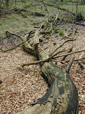 Toter BaumDer tote Baum liegt am Abhang der Schlucht, in der sich das sumpfige Quellgebiet des Süstedter Bachs befindet.Auf dem Bild ist es nicht so gut zu erkennen, aber dieser Abhang ist teilweise sehr steil, was bedeutet, dass sich diese Schlucht im Laufe der Zeit tief in den Geestrand hineingeschnitten hat. |