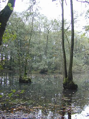 Die Baumwurzeln sind zu sehen, ein Zeichen dafür, das der Teich nicht angestaut ist.
